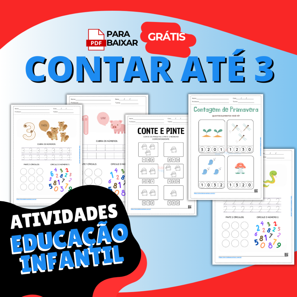 Pensando em auxiliar educadores, pais e responsáveis, disponibilizamos uma atividade em PDF para alunos de Educação Infantil sobre contar até 3. Essa atividade pode ser baixada clicando no link abaixo: