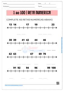 Nas primeiras duas atividades, os alunos deverão completar retas numéricas com os números que faltam, seguindo a ordem crescente de diferentes sequências que estão entre 1 e 100. Estas atividades são fundamentais para desenvolver a compreensão da sequência numérica e a capacidade de identificar e preencher lacunas numéricas. O professor pode começar explicando a importância da ordem crescente e demonstrar como identificar os números que faltam em uma reta numérica. Em seguida, os alunos podem preencher as lacunas nas retas fornecidas, contando em voz alta para reforçar a memorização. Durante a atividade, o professor deve circular pela sala, oferecendo suporte individual e verificando a precisão das respostas dos alunos.