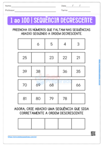 Na segunda atividade, os alunos têm a tarefa de completar uma sequência decrescente que vai do 100 ao 1, preenchendo os números que estão faltando. Essa atividade é excelente para reforçar a compreensão da ordem decrescente em um intervalo mais amplo e ajuda os alunos a familiarizarem-se com a sequência completa dos números. Trabalhar com uma sequência tão extensa também pode melhorar a memória e a concentração, uma vez que os alunos precisam lembrar e identificar corretamente os números que faltam.