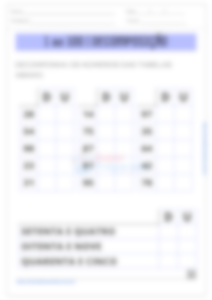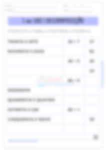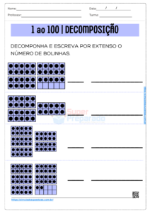 Na quarta atividade, os alunos devem decompor os números nas três primeiras tabelas, dividindo-os em dezenas e unidades. Na quarta e última tabela, eles devem repetir o mesmo processo, mas com base em números por extenso. Esta atividade reforça a habilidade de decomposição numérica, tanto a partir de algarismos quanto de números por extenso. O professor pode explicar a atividade com exemplos, mostrando como decompor números em dezenas e unidades. Durante a atividade, os alunos podem preencher as tabelas em suas folhas, com o professor oferecendo suporte e revisando as respostas.