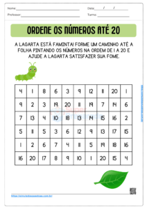Na primeira atividade, nossos alunos observarão uma situação-problema envolvendo uma lagarta que precisa chegar até uma folha para se alimentar. Para ajudá-la, o aluno deve percorrer, pintando os quadrados, o caminho que segue a ordem que segue do número 1 ao número 20. Essa atividade ajuda as crianças a praticarem a sequência numérica de forma divertida e envolvente.