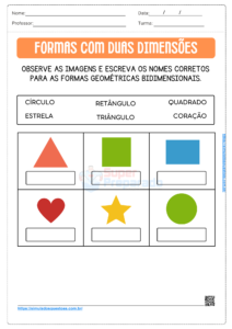 Na primeira atividade, os alunos serão apresentados a várias figuras bidimensionais, como círculo, quadrado, triângulo e retângulo. Eles devem nomear corretamente essas figuras utilizando as palavras fornecidas no quadro. Essa atividade ajuda a desenvolver o reconhecimento visual das formas geométricas e a associação entre os nomes e as formas correspondentes.