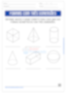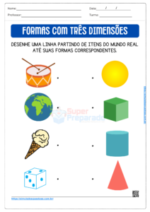 Na última atividade, os alunos terão que informar o nome de cada uma das seis figuras geométricas na atividade. Esta atividade desenvolve o vocabulário geométrico e a habilidade de reconhecer e nomear diferentes formas tridimensionais, como cubo, pirâmide e esfera. Use modelos reais ou figuras em 3D para ajudar na visualização e na memorização dos nomes.