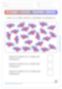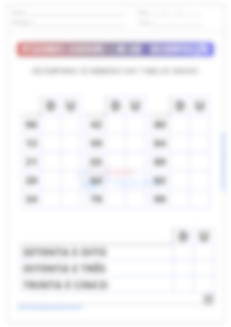 Na terceira atividade, o aluno irá se deparar com um quadro repleto de figuras de avião. Seu dever é contá-los e informar, nas perguntas abaixo, quantos grupos de 2, de 5 e de 10 podem ser formados no total. Esta atividade desenvolve habilidades de contagem e agrupamento, além de introduzir os conceitos básicos de divisão e multiplicação de maneira simples e intuitiva. Incentive os alunos a contarem os aviões de forma ordenada e a utilizarem estratégias de agrupamento para facilitar a contagem e a formação dos grupos.