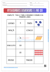 Na primeira atividade, o aluno deve completar a tabela conforme apresentado no exemplo. Na primeira coluna, temos o nome das figuras; na segunda coluna, temos a quantidade expressa em número; na terceira coluna, temos a quantidade expressa por extenso e; na última coluna, há o desenho da quantidade de elementos pedida. Esta atividade desenvolve habilidades de contagem, associação entre numerais e suas representações por extenso, além de promover a compreensão visual de quantidades. Explique a importância de entender as diferentes formas de representar números e auxilie os alunos na leitura e escrita dos numerais por extenso, garantindo que compreendam cada etapa do processo.