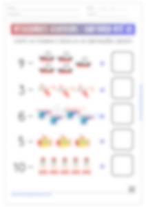 Na última atividade, os alunos terão que contar as figuras em cada conta para descobrir o valor escondido e resolver a subtração. Por exemplo, se há o número 9 e contamos 5 navios, temos a conta 9 – 5 = 4. Esta atividade desenvolve habilidades de subtração e contagem. Utilize materiais visuais, como figuras ou desenhos, para ajudar os alunos a visualizar a subtração. Explique a operação de subtração com exemplos concretos e verifique a compreensão dos alunos por meio de prática guiada.