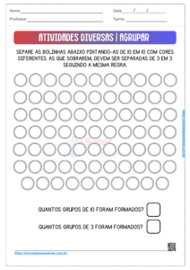 Na primeira atividade, os alunos devem separar bolinhas em grupos de 10, pintando-as com uma mesma cor. Se sobrarem bolinhas, estas devem ser agrupadas de 3 em 3 seguindo a mesma regra. Ao final, o aluno deve informar quantos grupos de 10 e de 3 foram formados. Esta atividade desenvolve habilidades de contagem, agrupamento e reconhecimento de padrões. Explique a importância de contar e agrupar para organizar informações. Auxilie os alunos na contagem inicial, garantindo que entendam o conceito de agrupar em dezenas e trios.