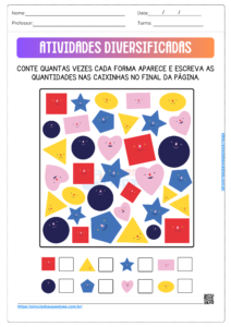 Na primeira atividade, os alunos devem contar quantas vezes cada figura geométrica aparece no quadro e registrar essas quantidades na legenda ao final da página. Esta atividade visa desenvolver a habilidade de contagem e reconhecimento das formas geométricas básicas. Os alunos também praticam a escrita ao registrar as quantidades observadas. Incentive os alunos a nomearem cada figura enquanto contam, para reforçar a associação entre nome e forma. Esta prática promove a observação detalhada e a habilidade de registrar informações.