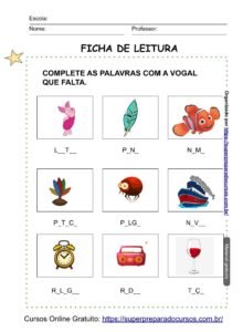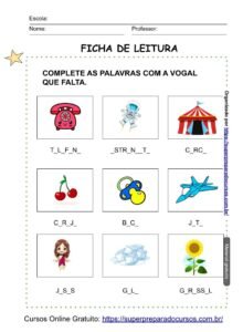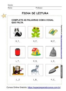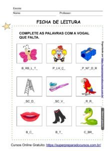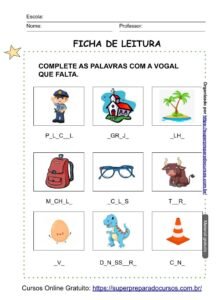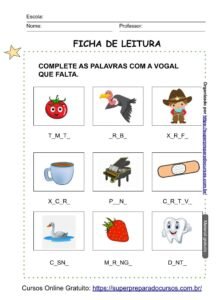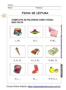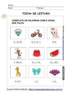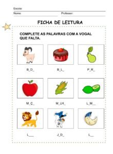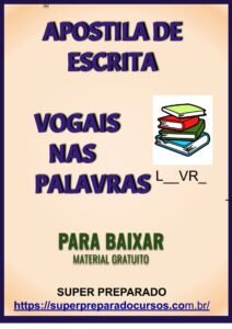 Apostila de Escrita vogais faltando nas palavras. O objetivo é identificar os sons das vogais nas palavras. Material colorido e em pdf. Aplique com seus alunos. São atividades de acordo com a BNCC. É só baixar e imprimir.  O material é colorido e ideal para plano de aulas. Este material poderá ser utilizado durante as aulas ou como atividades de reforço, para casa, etc. Também o professor ou professora pode utilizar para alunos com dificuldades de aprendizagem em turmas de EJA ou séries iniciais do Ensino Fundamental. Para baixar, clique no link abaixo.