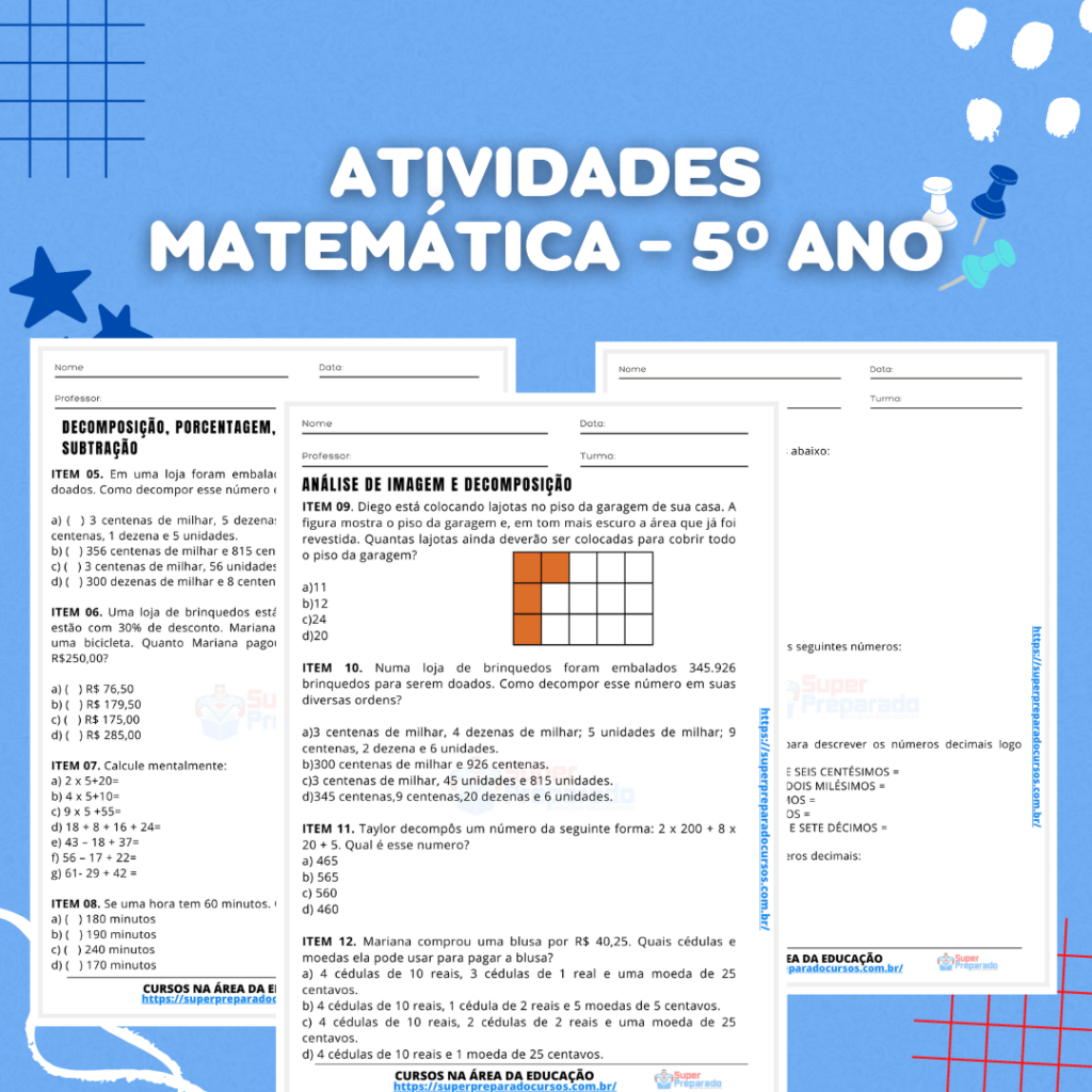 Atividade de Matemática – 5º ano. É só baixar e imprimir, o material é ideal para plano de aulas. Este material poderá ser utilizado durante as aulas ou como atividades de reforço, para casa, etc. Além disso, o professor ou professora pode utilizar para alunos com dificuldades de aprendizagem em turmas de EJA ou séries iniciais do Ensino Fundamental. Para baixar, clique no link abaixo.