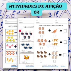 Apostila com atividades de adição. Material para Educação Infantil e Ensino Fundamental. É só baixar e imprimir.  O material é colorido e ideal para plano de aulas. Este material poderá ser utilizado durante as aulas ou como atividades de reforço, para casa, etc. Também o professor ou professora pode utilizar para alunos com dificuldades de aprendizagem em turmas de EJA ou séries iniciais do Ensino Fundamental. Para baixar, clique no link abaixo.