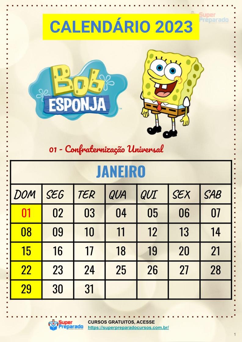 Calendário 2023 – Bob Esponja. Para baixar, clique no link abaixo. BAIXAR – Calendário