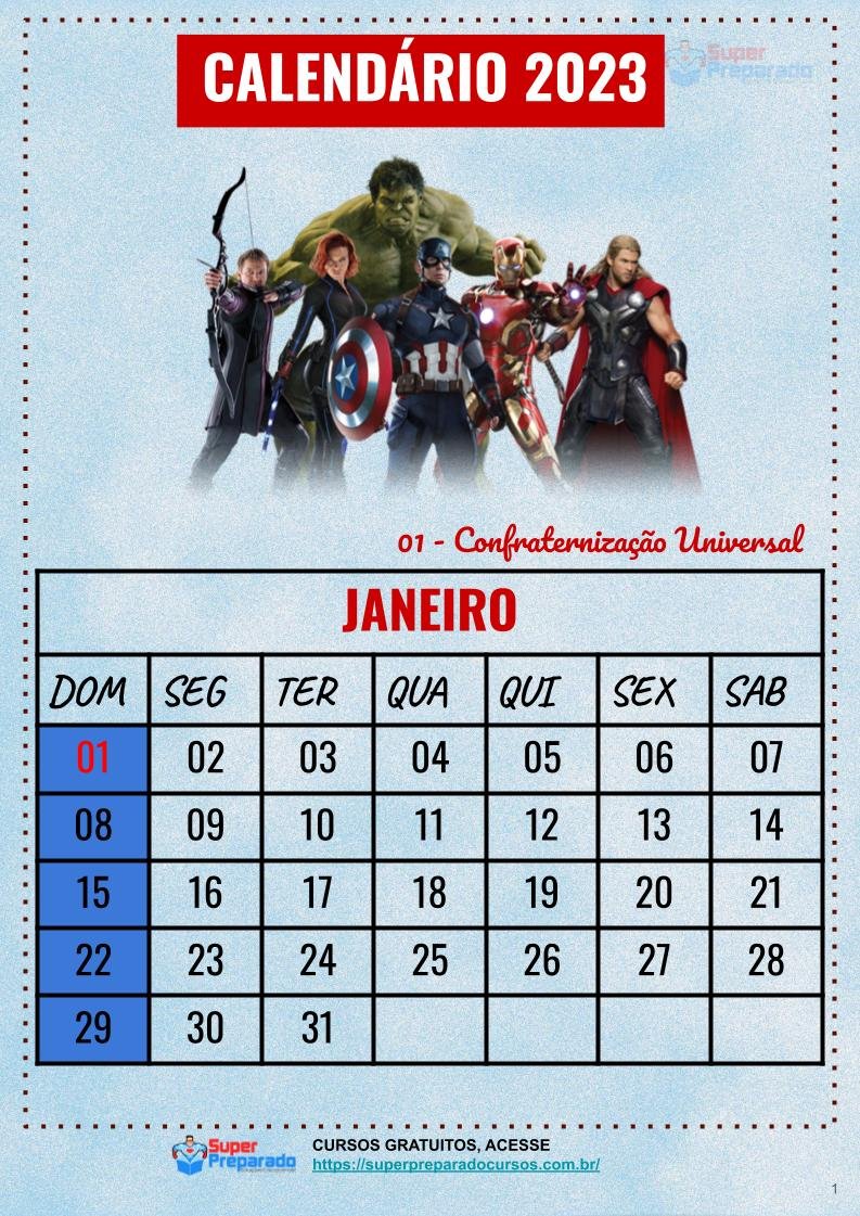 Calendário 2023 – Vingadores. Para baixar, clique no link abaixo. BAIXAR – Calendário