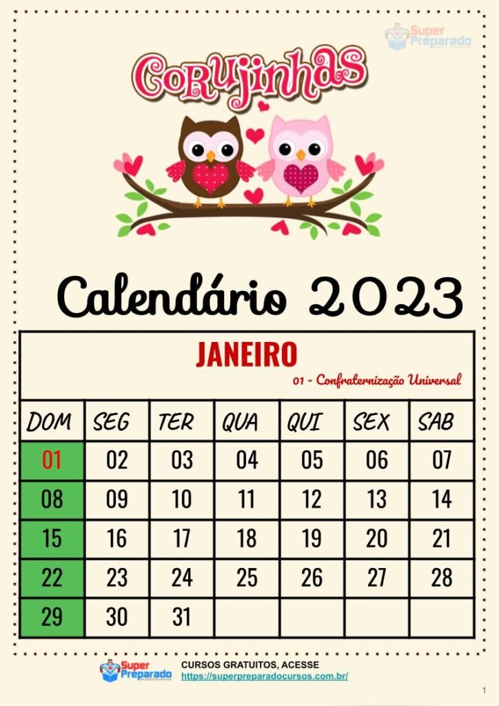 Calendário 2023 -Corujinhas. Para baixar, clique no link abaixo.