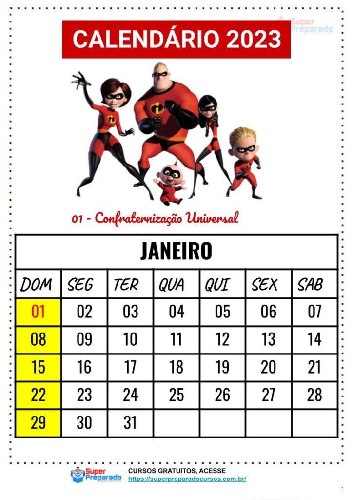 Calendário 2023 – Os incríveis. Para baixar, clique no link abaixo.