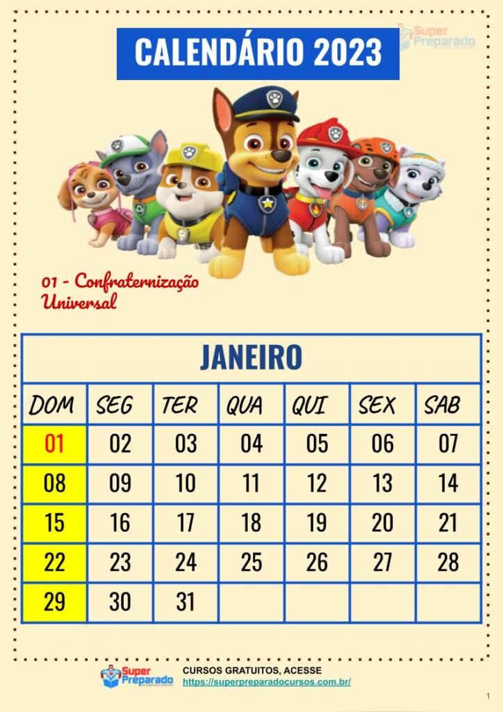 Calendário 2023 – Patrulha canina. Para baixar, clique no link abaixo.