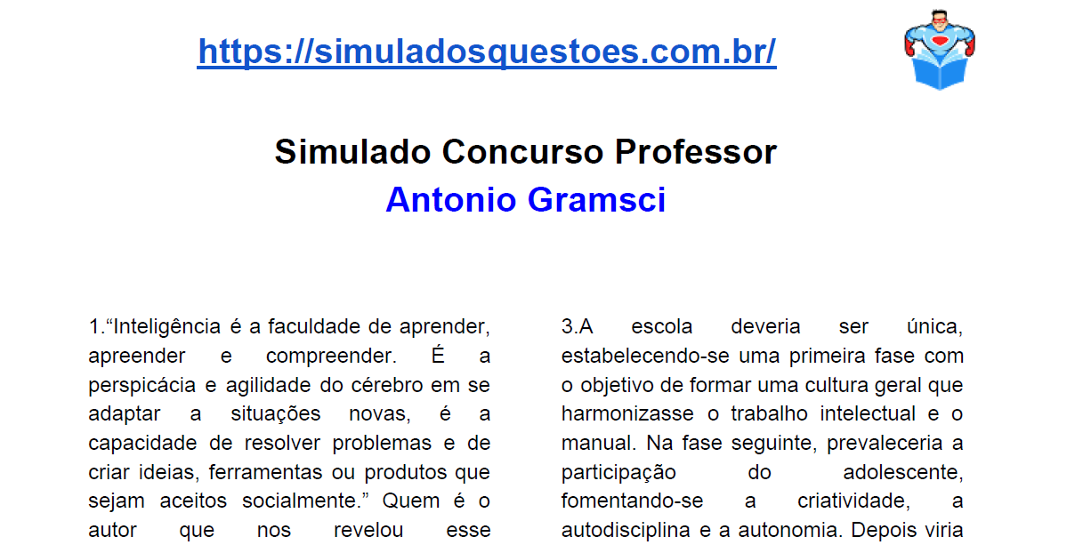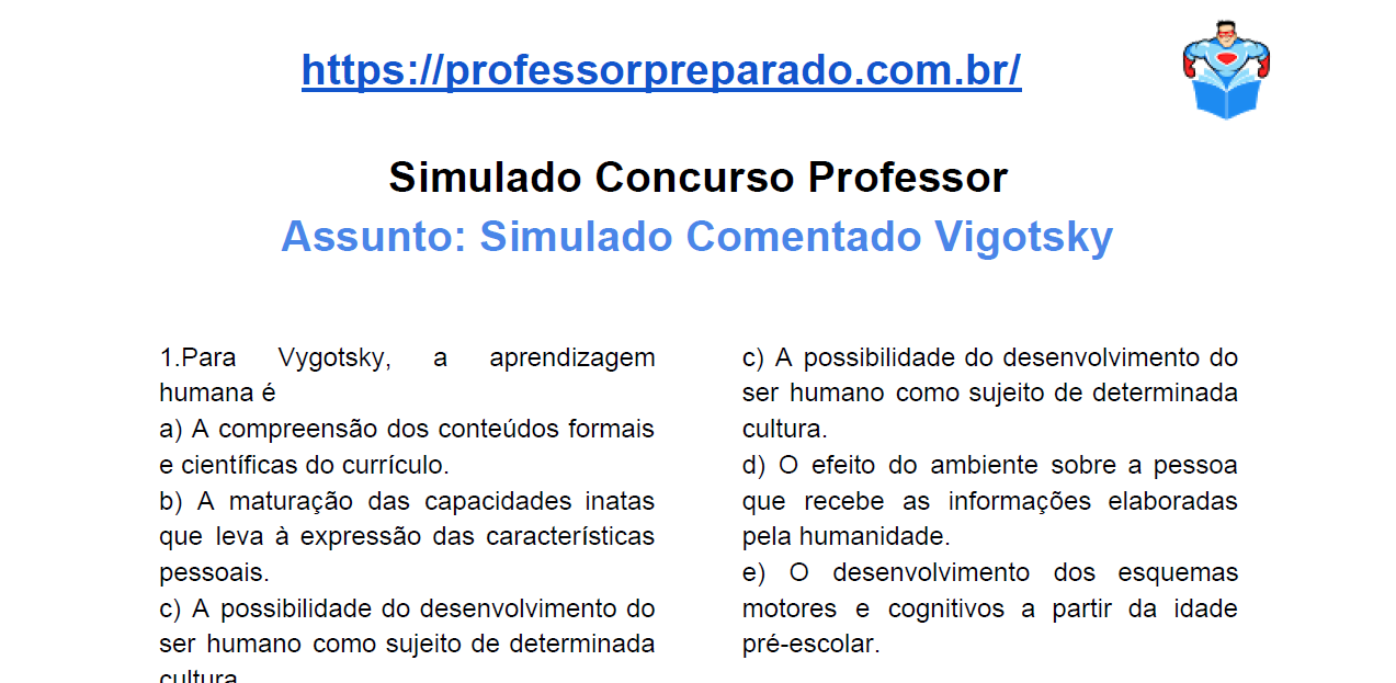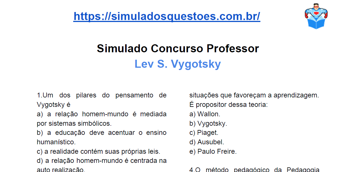 Procurando material de estudo para o cargo de professor?! Aqui neste post você encontra um material que ajudará na sua aprovação. O simulado é sobre Lev Vygotsky e você pode baixar gratuitamente. São questões sobre o tópico de conhecimentos pedagógicos. Baixe e bons estudos! Simulado Comentado Lev Vygotsky-BAIXAR!