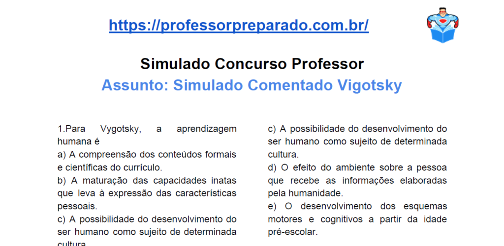 Procurando material de estudo para o cargo de professor?! Aqui neste post você encontra um material que ajudará na sua aprovação. O simulado é sobre Lev Vygotsky e você pode baixar gratuitamente. São questões sobre o tópico de conhecimentos pedagógicos. Baixe e bons estudos!