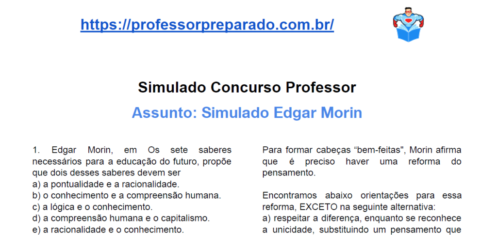 Procurando material de estudo para o cargo de professor?! Aqui neste post você encontra um material que ajudará na sua aprovação. O simulado é sobre o teórico Edgar Morin e você pode baixar gratuitamente. São questões sobre o tópico de conhecimentos pedagógicos. Baixe e bons estudos!
