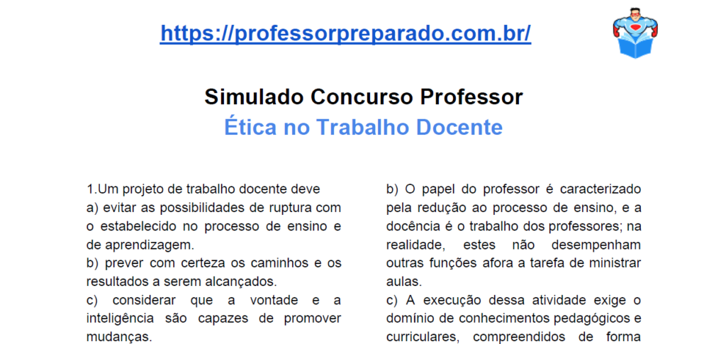 Olá! Hoje trouxemos um super simulado para o estudo do seu concurso para professor. Este simulado está em PDF e você pode baixar para estudar em qualquer lugar. O simulado trata-se sobre Ética no Trabalho Docente um tema muito recorrente em concurso para o cargo de professor. Baixe gratuitamente!