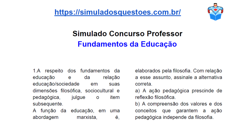 Oi, como está?! Esse post traz para você concurseiro(a) de plantão um material de estudo imperdível para o concurso de professor, gestores, pedagogos e todos os cargos na área da educação. O simulado é sobre Fundamentos da Educação, assunto muito recorrente em provas de concurso. Baixe o simulado e bons estudos!