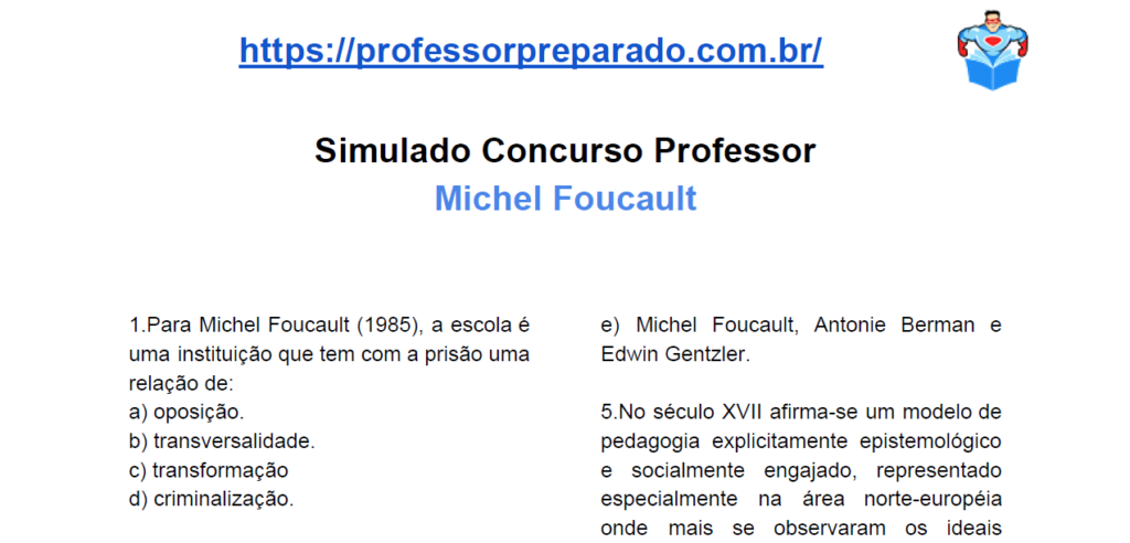 Procurando material de estudo para o cargo de professor?! Aqui neste post você encontra um material que ajudará na sua aprovação. O simulado é sobre Michel Foucault e você pode baixar gratuitamente. São questões sobre o tópico de conhecimentos pedagógicos. Baixe e bons estudos!