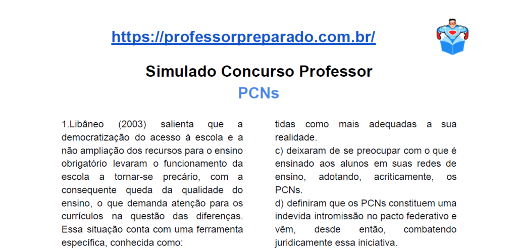Procurando material de estudo para o cargo de professor?! Aqui neste post você encontra um material que ajudará na sua aprovação. O simulado é sobre os PCNs e você pode baixar gratuitamente. São questões sobre o tópico de conhecimentos pedagógicos. Baixe e bons estudos!